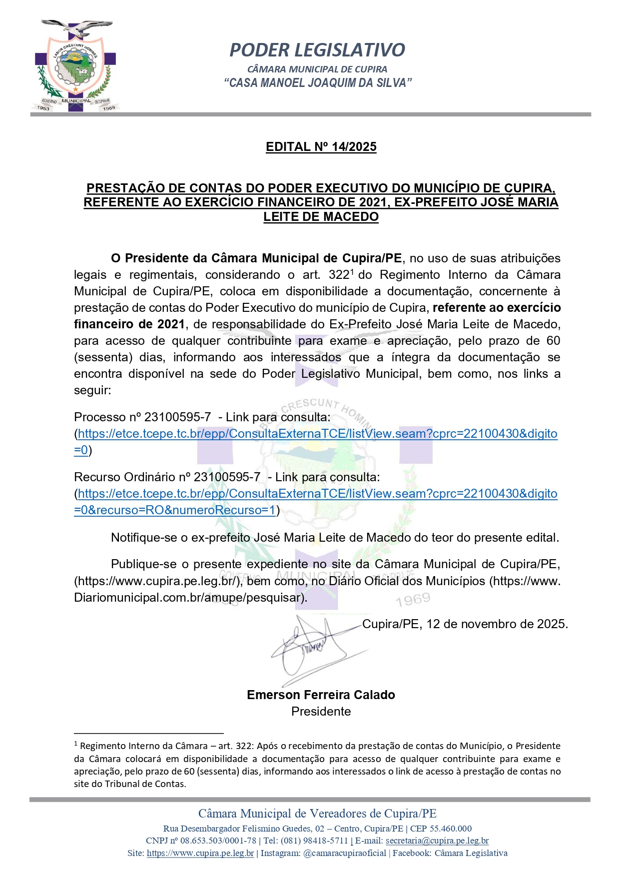 O Presidente da Câmara Municipal de Cupira/PE, no uso de suas atribuições legais e regimentais, considerando o art. 148 da Lei Orgânica do Município de Cupira l , bem como o art. 3222 do Regimento Interno da Câmara Municipal de Cupira, coloca em disponibilidade a documentação, concernente à prestação de contas do Poder Executivo do município de Cupira, referente ao exercício financeiro de 2021, de responsabilidade do Ex-Prefeito José Maria Leite de Macedo, para acesso de qualquer contribuinte para exame e apreciação, pelo prazo de 60 (sessenta) dias, informando aos interessados que a íntegra da documentação se encontra disponível na sede do Poder Legislativo Municipal, ou através do link.